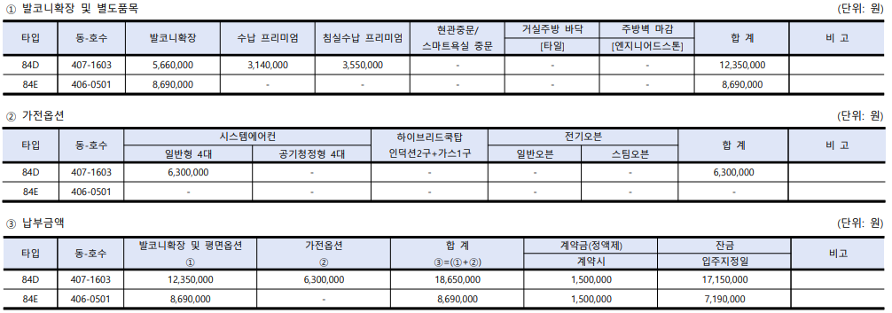이번 줍줍 407동 1603호, 406동 501호는 각각 남서향, 남동향이며 타입은 타워형, 4bay 구조입니다.