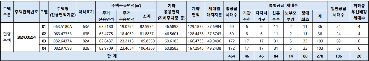 | 규모 | 지하 3층 ~ 지상 29층, 5개동, 총 464세대 (특별공급 278세대) |