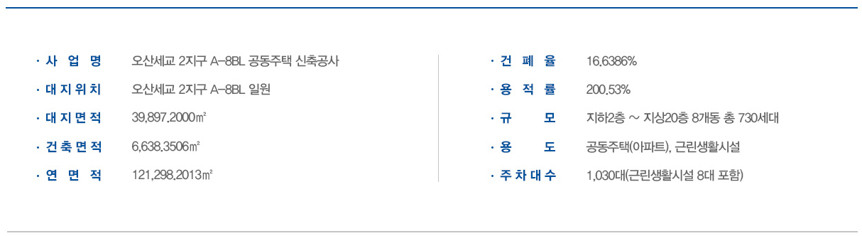 | 규모 | 지하 2층 ~ 지상 17~20층, 8개동, 총 730세대 (특별공급 430세대) |