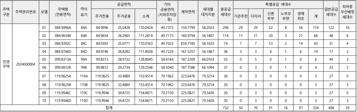 | 규모 | 지하 3층 ~ 지상 20층, 11개동, 총 732세대 (특별공급 324세대) |