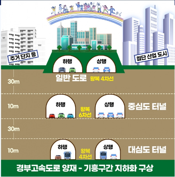 이 구간은 상습적으로 정체가 발생해 확장이 시급하다는 지적이 많았지만 고속도로 주변 도시화로 더이상 지상 확장이 어려운 상황이었습니다. 정부는 지하 고속도로 건설을 통해 경부고속도로의 상습 지,정체가 일부 해소될 것으로 기대하고 있습니다.
