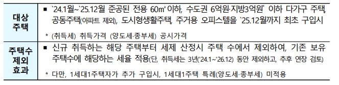 - 등록임대 : 24년 1월~25년 12월 사이 구입 및 임대 등록한 소형기축주택(전용 60제곱미터 이하, 수도권 6억, 지방 3억 이하 다가구 주택, 공동주택(아파트제외), 도시형 생활주택, 주거용 오피스텔) 세제 산정시 주택수 제외