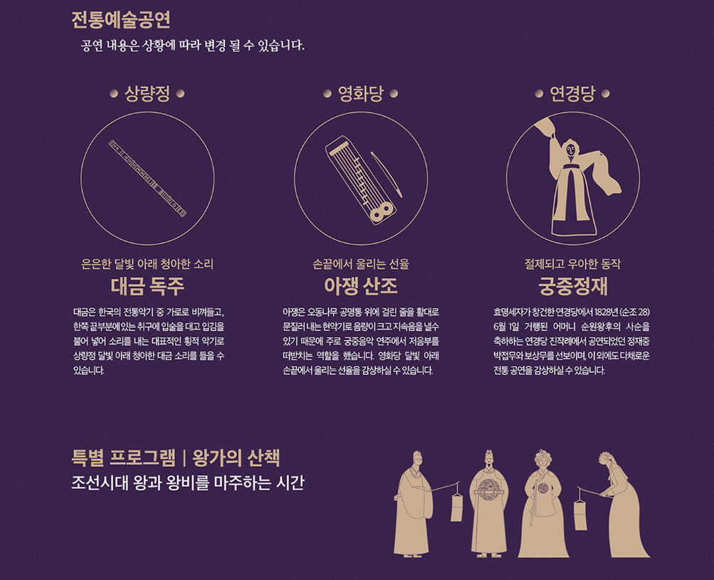 창덕궁 달빛기행은 은은 달빛아래 녹음이 어우러진 창덕궁에서 전문해설사와 함께 궁궐의 곳곳을 관람하며, 각 전각에 대한 해설과 전통예술공연을 관람할 수 있는 프로그램입니다.